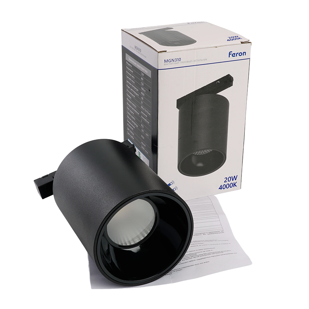 Светильник трековый на шинопровод, - (ДПО) FERON MGN310, 20W, 4000К (белый), 48V, 1800Lm, цвет черный, корпус алюминий, рассеиватель поликарбонат, 116*95*163 мм
