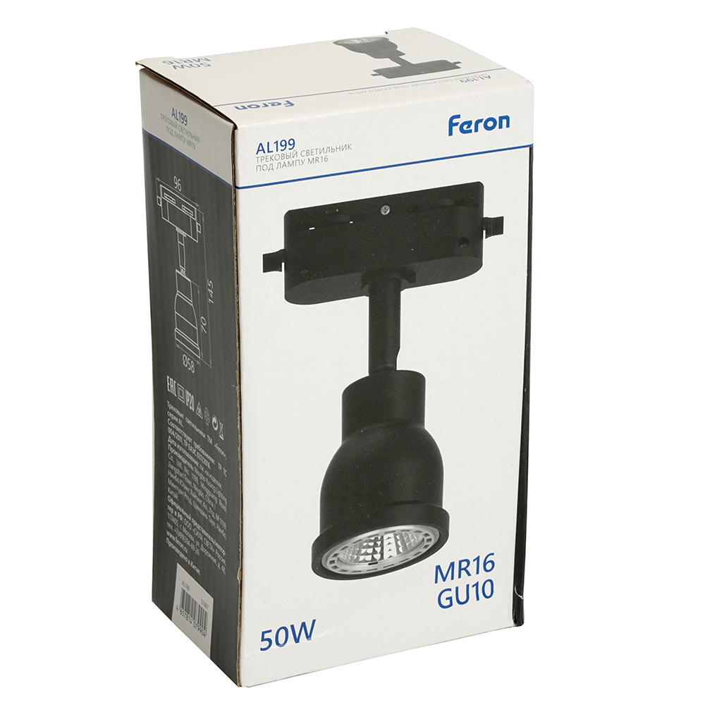 Светильники трековые на шинопровод GU10, однофазный (ИВО) FERON AL199, 50W, 230V, цвет черный, корпус сталь, вращение →350°/↓90°, 96*58*145 мм